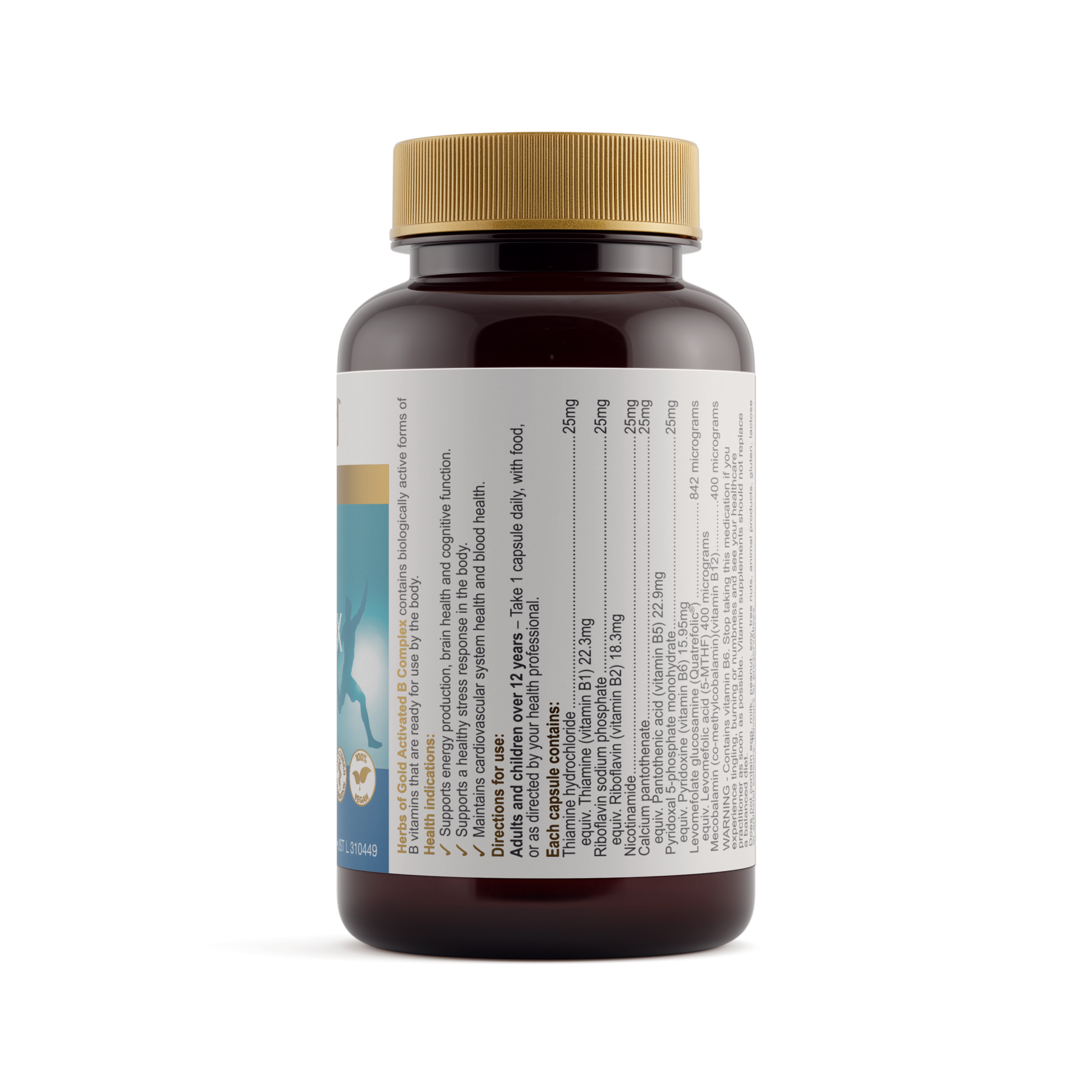 Herbs of Gold Activated B Complex contains activated B vitamins, including B2, B6, methylfolate (folate) and mecobalamin (B12), to help support energy production and assist in the maintenance of general wellbeing.