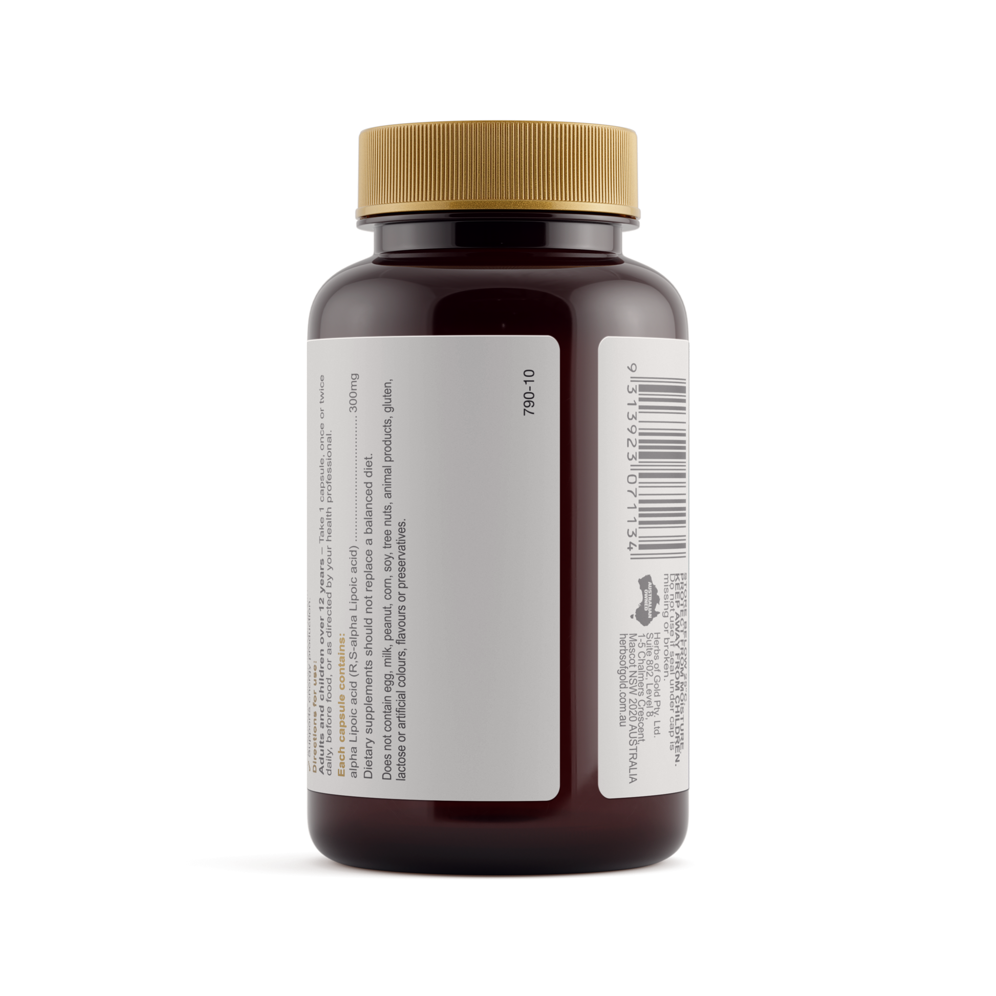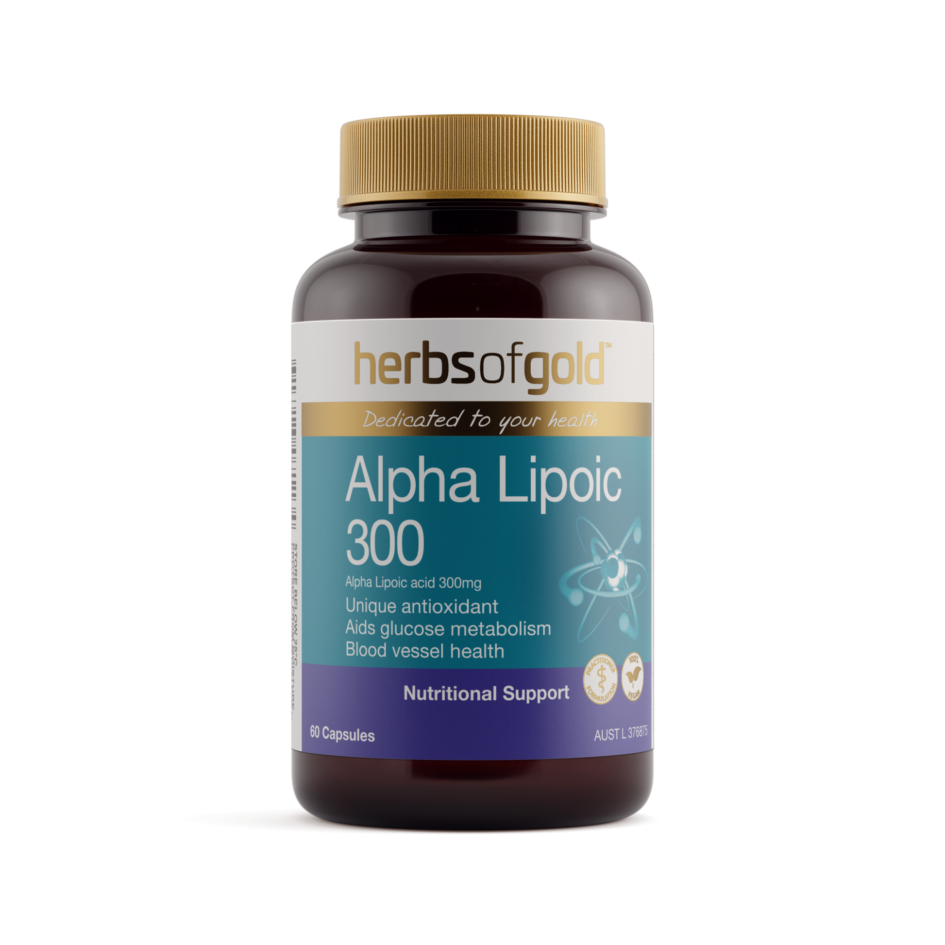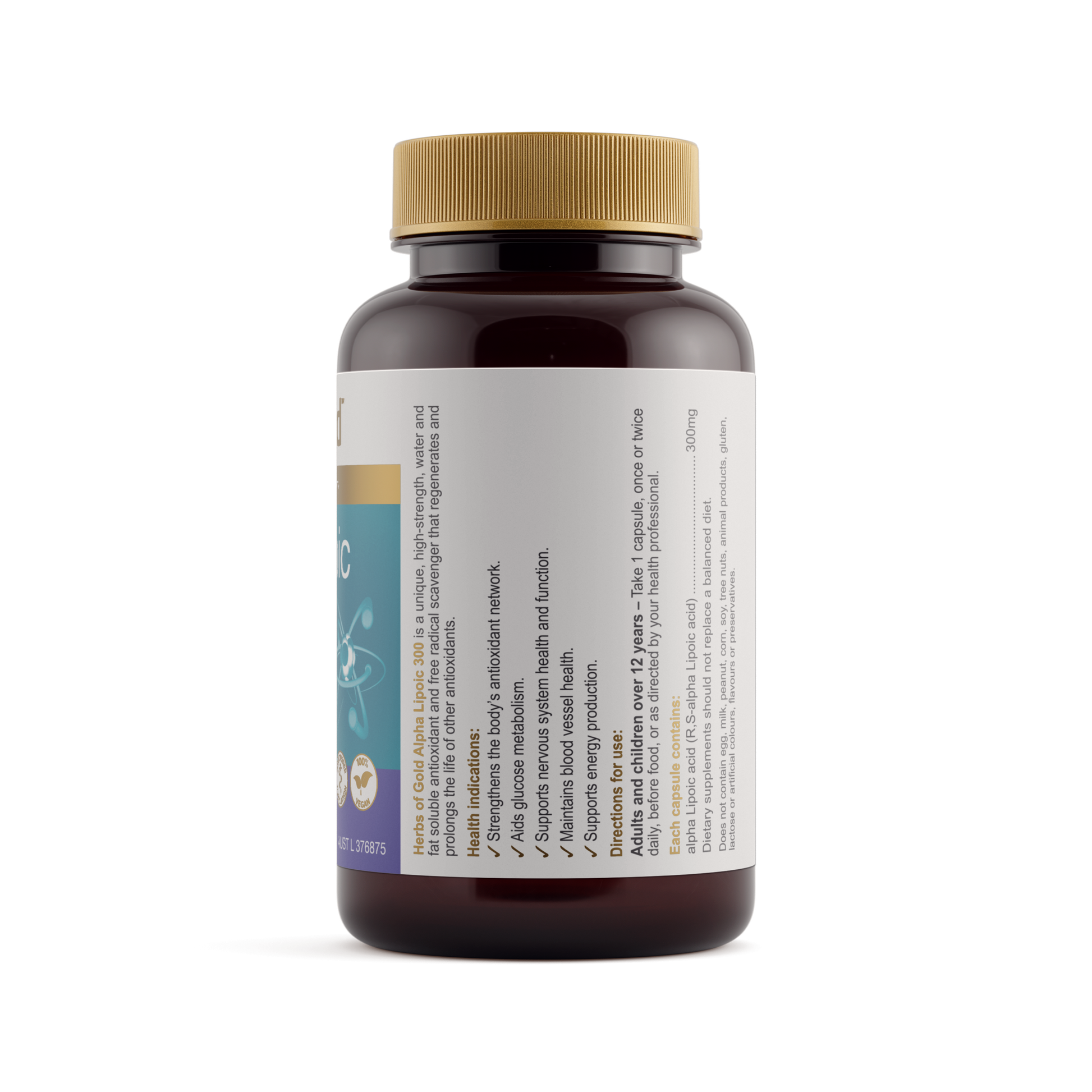 Herbs of Gold Alpha Lipoic 300 contains high-strength alpha Lipoic acid, an antioxidant that reduces free radicals formed in the body.