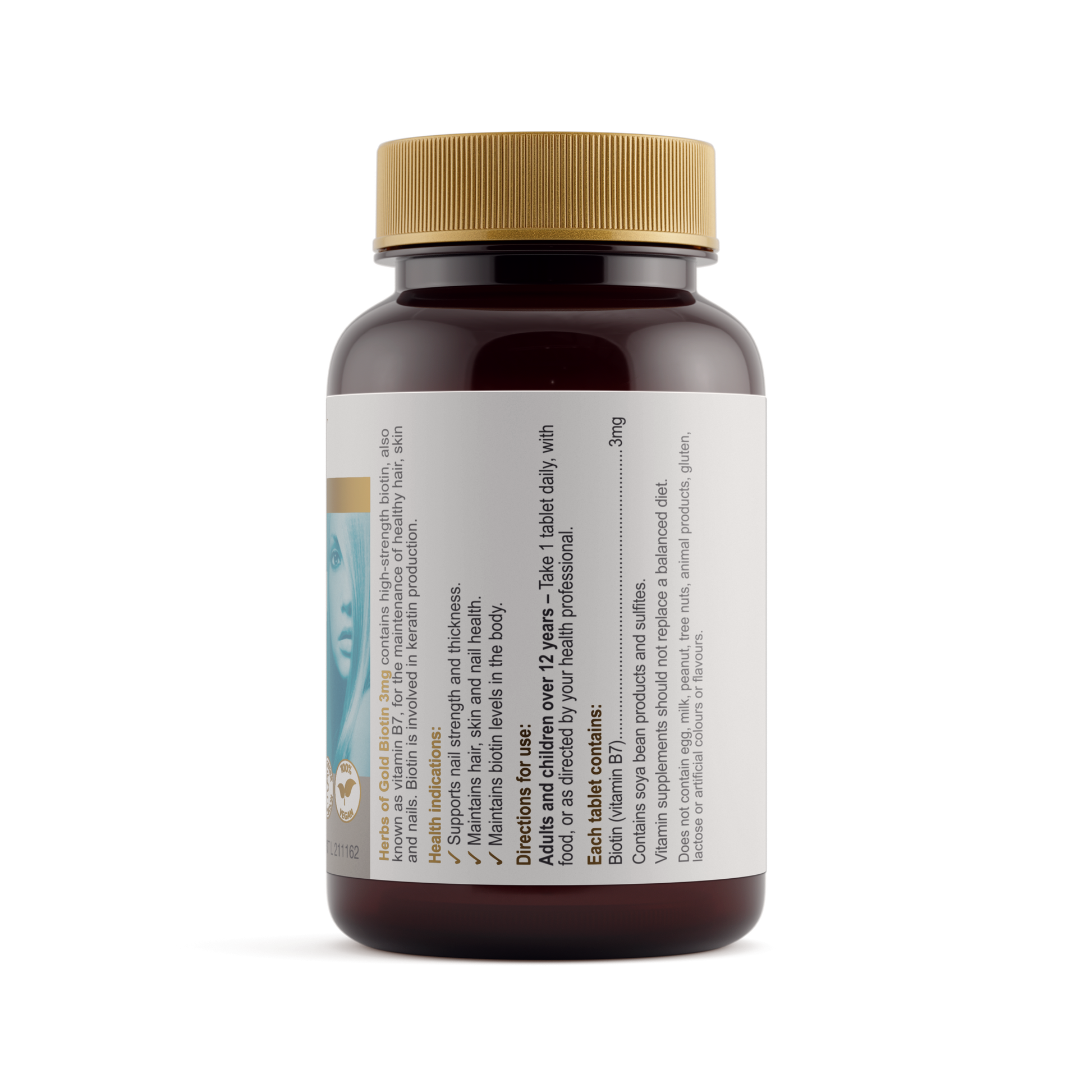 Herbs of Gold Biotin 3mg provides high-strength biotin, also known as vitamin B7, to support healthy hair, skin and nails.