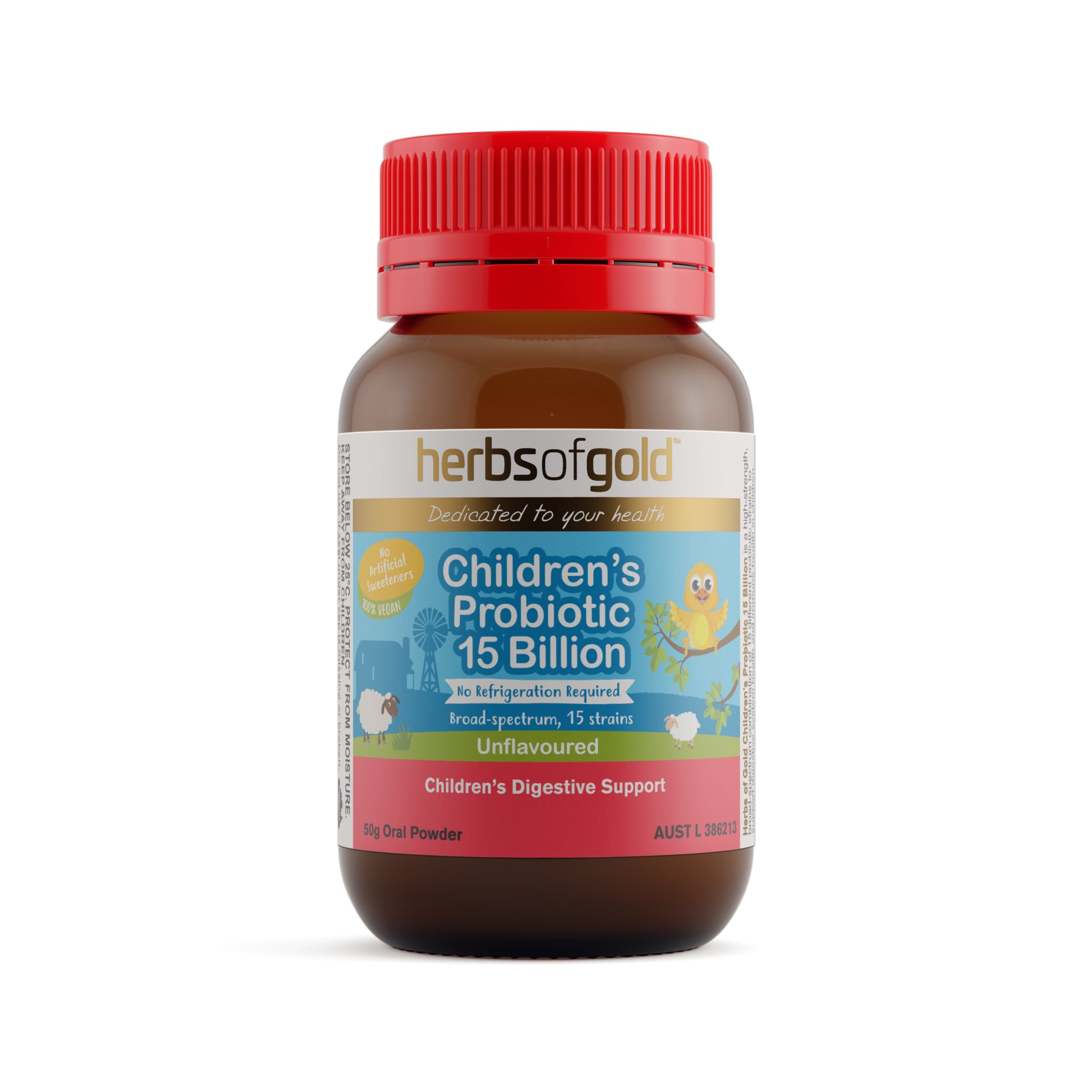 Herbs of Gold Children’s Probiotic 15 Billion is a high-strength, multi-strain unflavoured powder formulated to support beneficial flora and digestive system health in children.