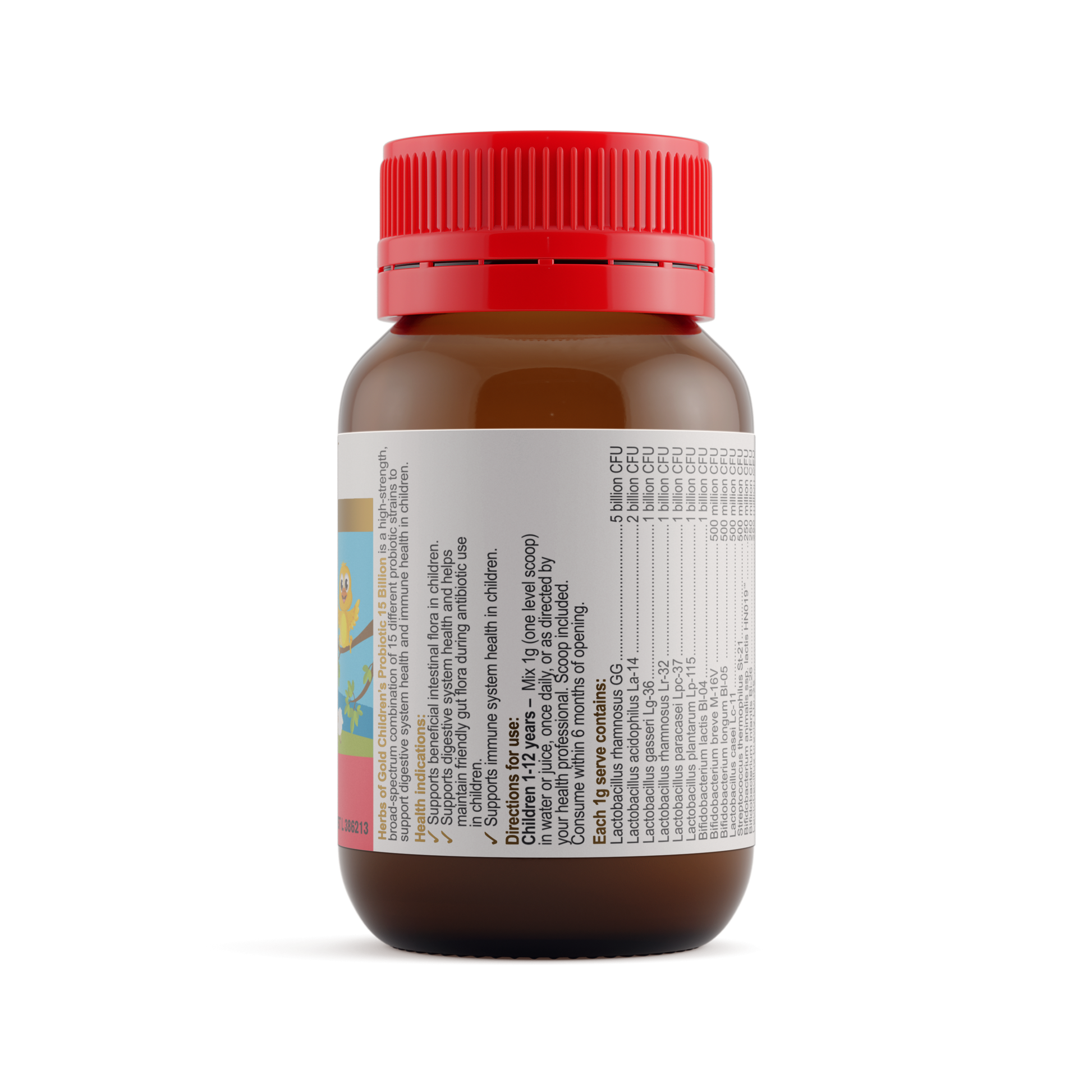 - Children’s Probiotic 15 Billion contains 15 different probiotic strains to help restore beneficial bowel flora in children.