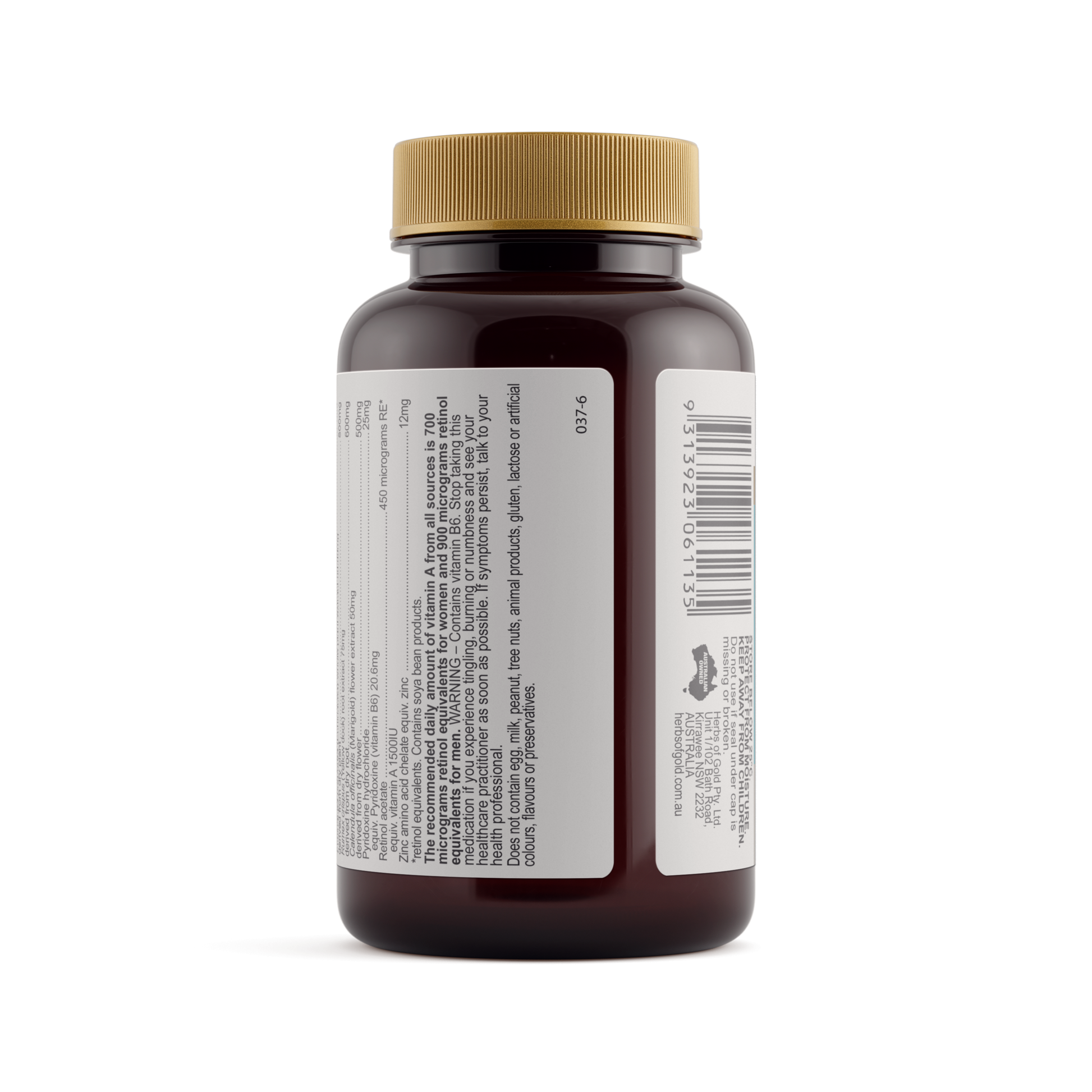 Always read the label and follow the directions for use. If symptoms persist, talk to your health professional. If you are pregnant, or considering becoming pregnant, do not take vitamin A supplements without consulting your doctor or pharmacist. The recommended daily amount of vitamin A from all sources is 700 micrograms retinol equivalents for women and 900 micrograms retinol equivalents for men. WARNING - When taken in excess of 3000 micrograms retinol equivalents, vitamin A can cause birth defects. Contains vitamin B6. Stop taking this medication if you experience tingling, burning or numbness and see your healthcare practitioner as soon as possible. Vitamin and mineral supplements should not replace a balanced diet. Contains soya bean products.