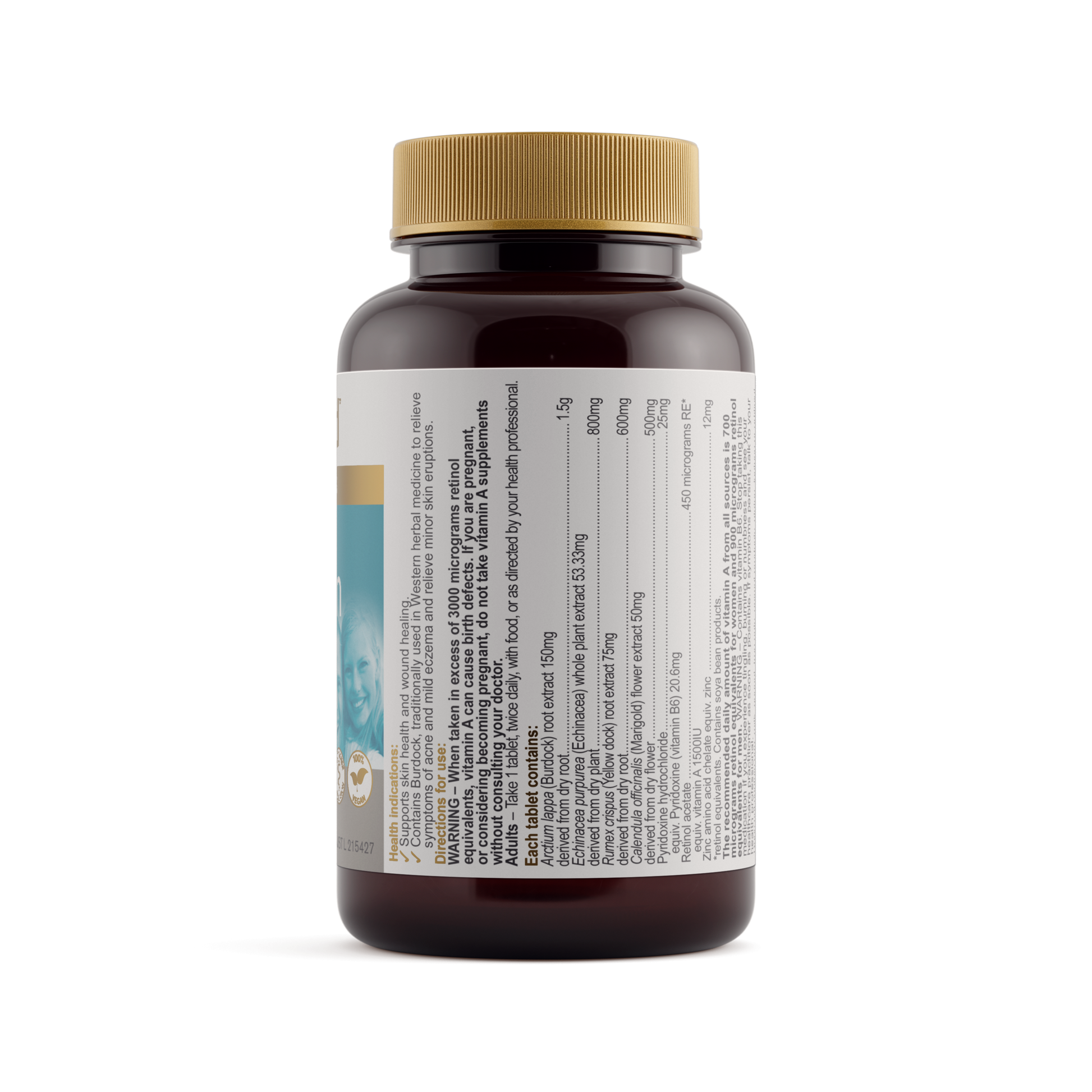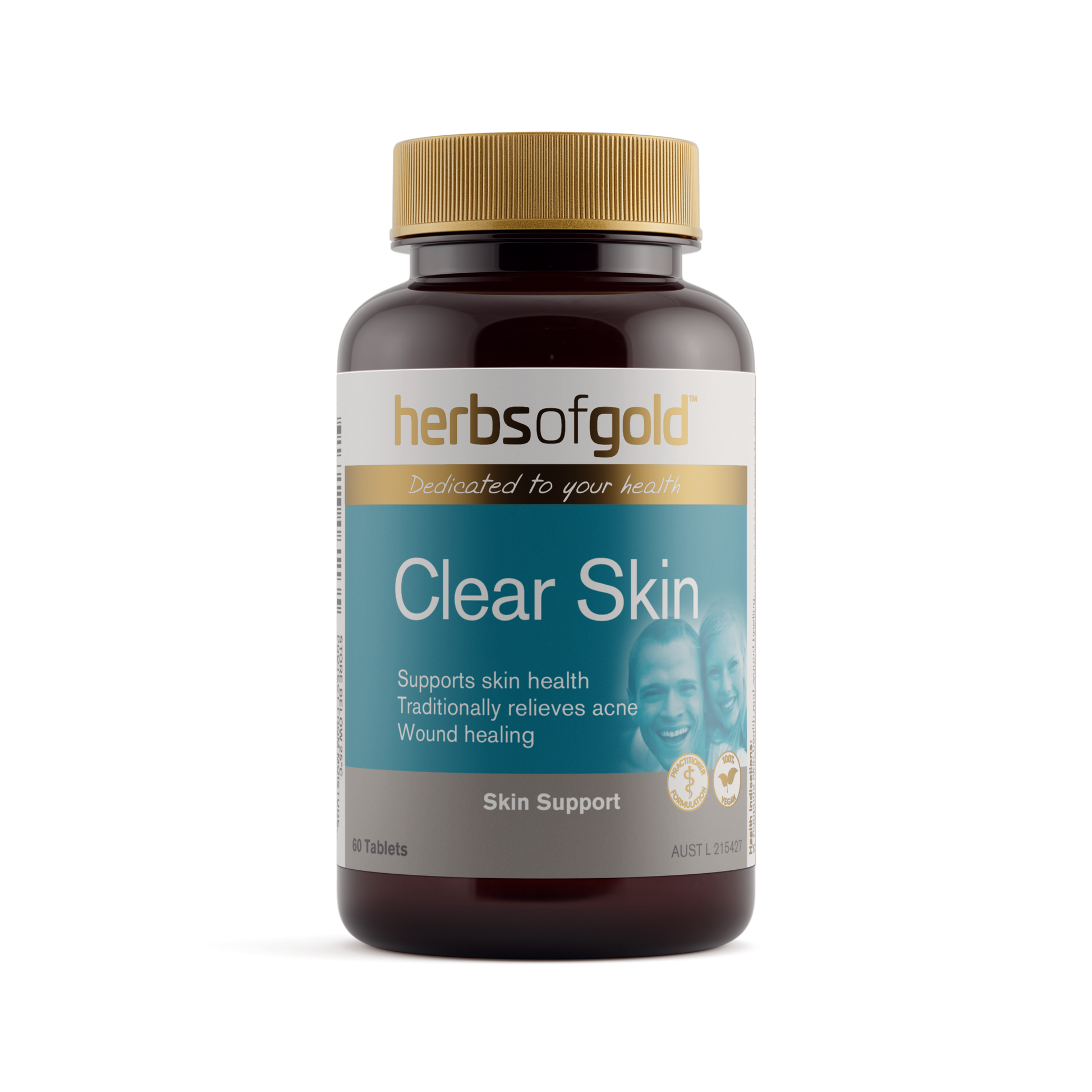 Herbs of Gold Clear Skin is a combination of nutrients plus Burdock and Yellow dock, herbs traditionally used in Western herbal medicine to support skin health.