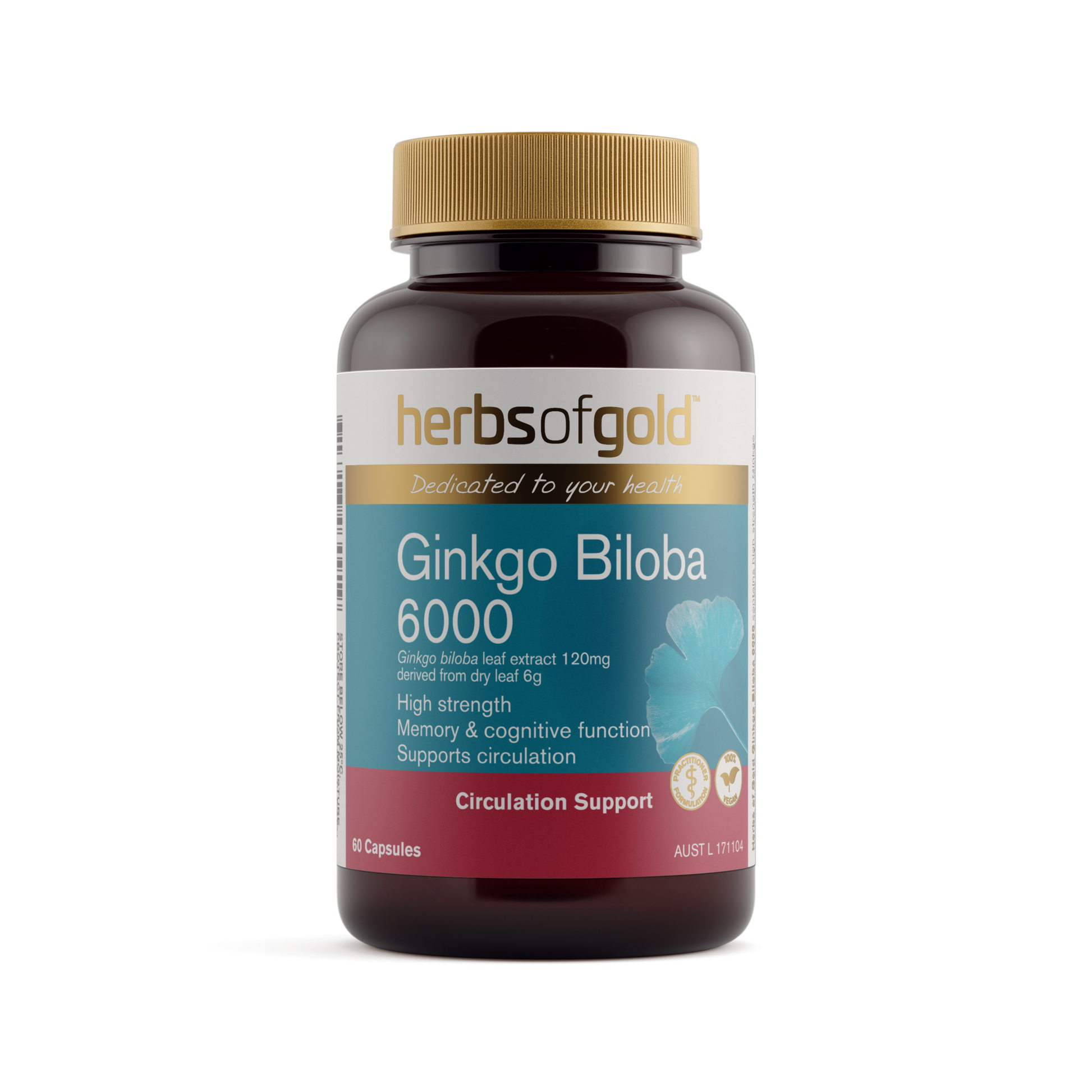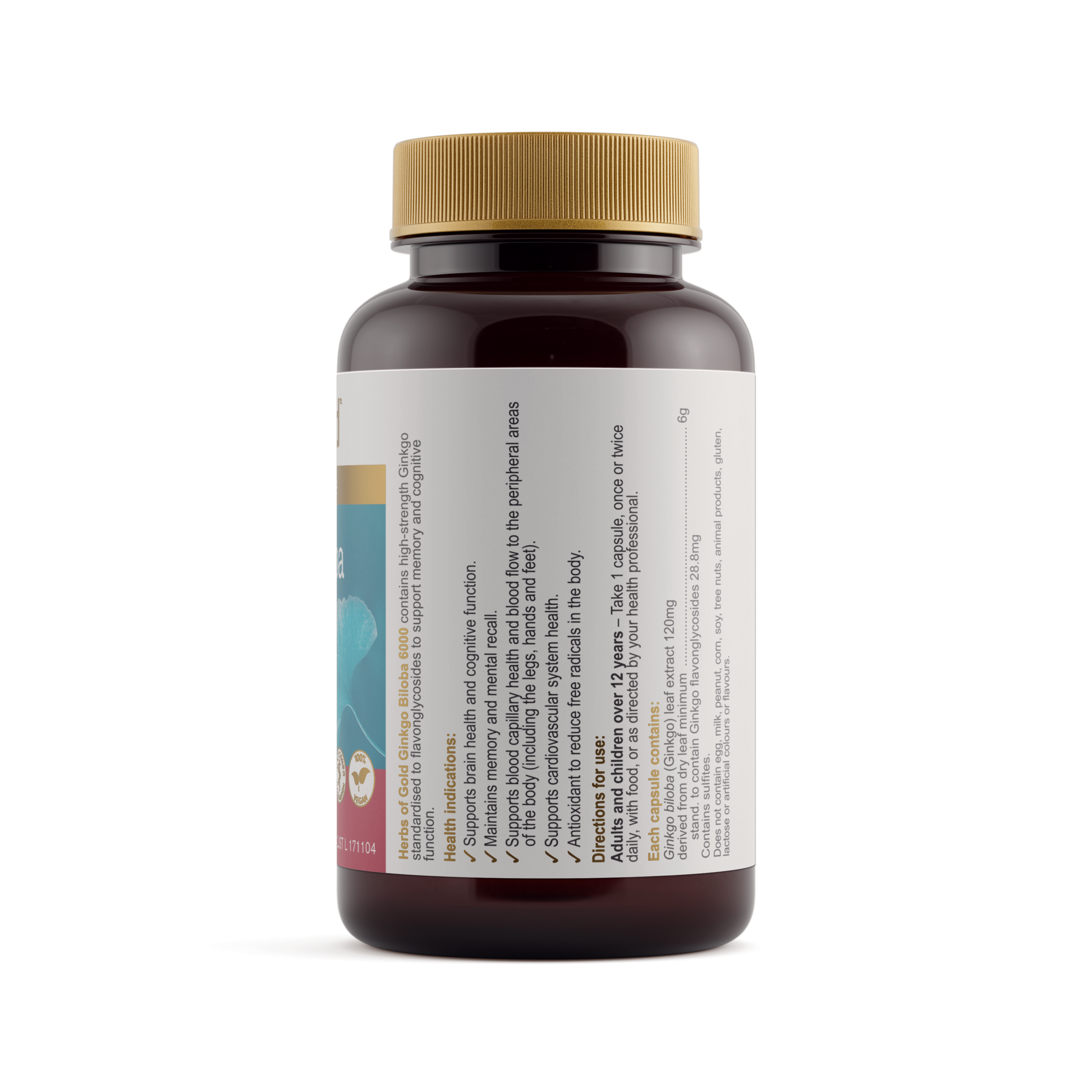 Herbs of Gold Ginkgo Biloba 6000 contains high-strength Ginkgo to support memory and cognitive function.