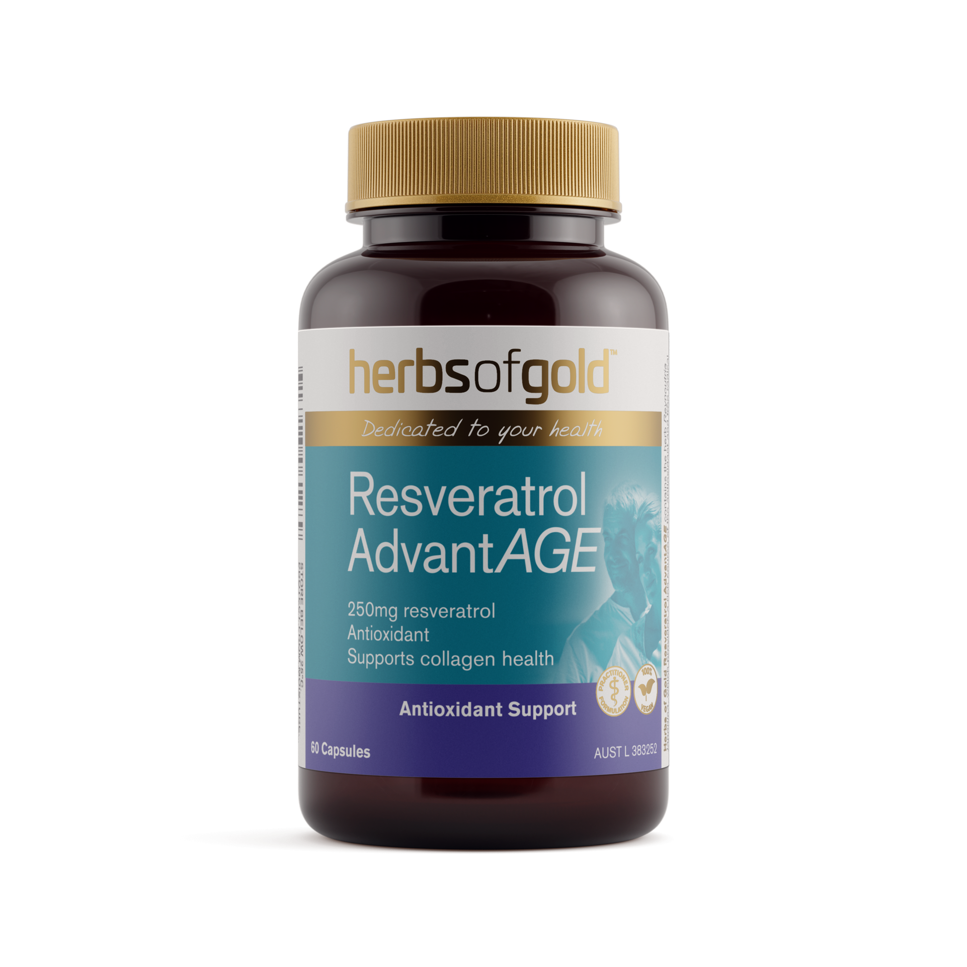 Herbs of Gold Resveratrol AdvantAGE is a high-strength antioxidant complex to help reduce free radicals formed in the body.