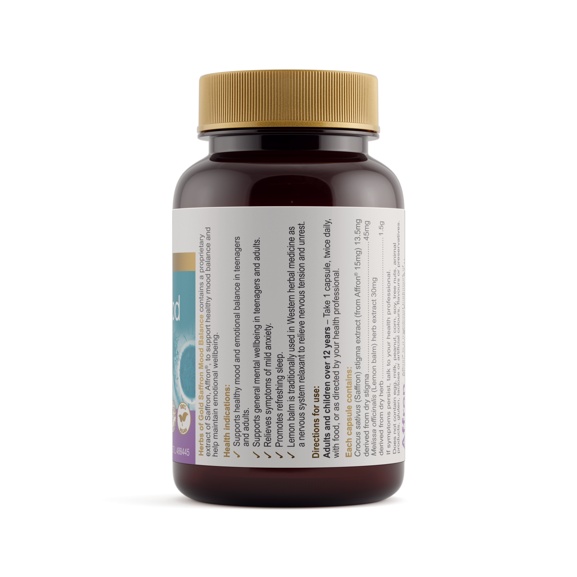 Herbs of Gold Saffron Mood Balance contains a unique blend of high-quality Saffron plus Lemon balm to support general mental wellbeing.