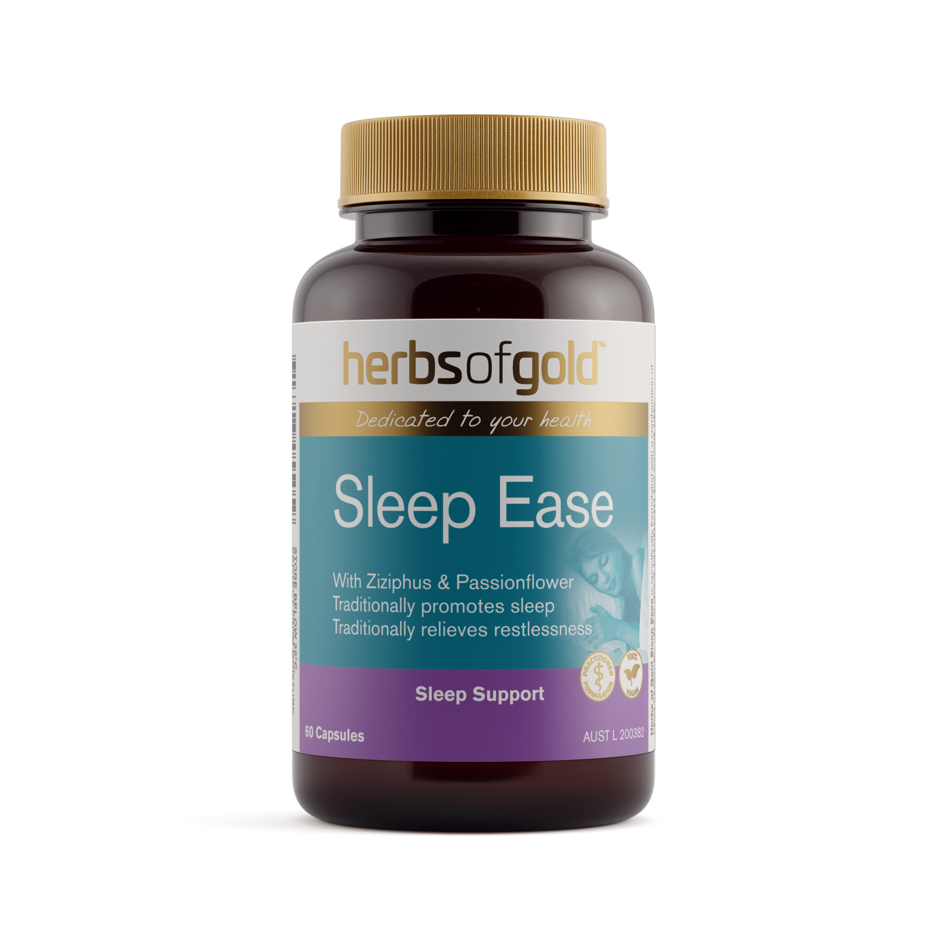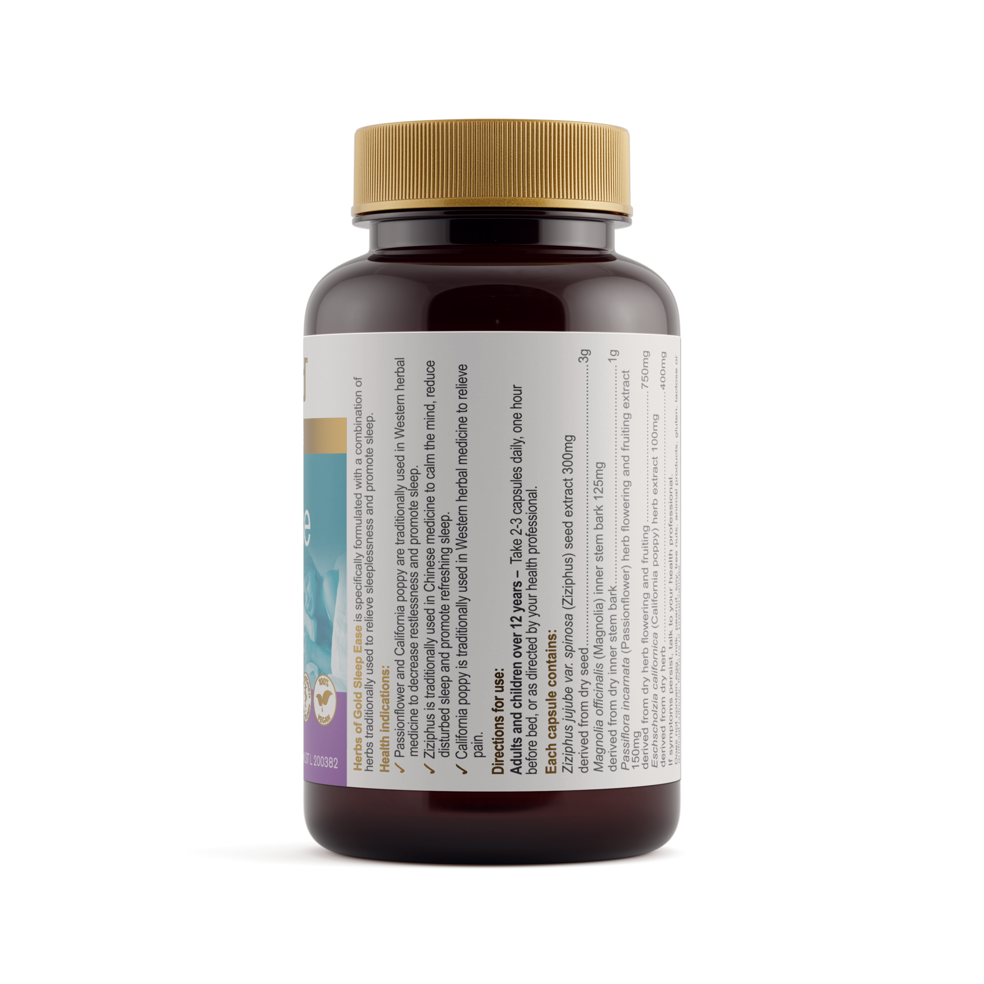 Herbs of Gold Sleep Ease contains herbs traditionally used in Western herbal medicine to promote sleep.