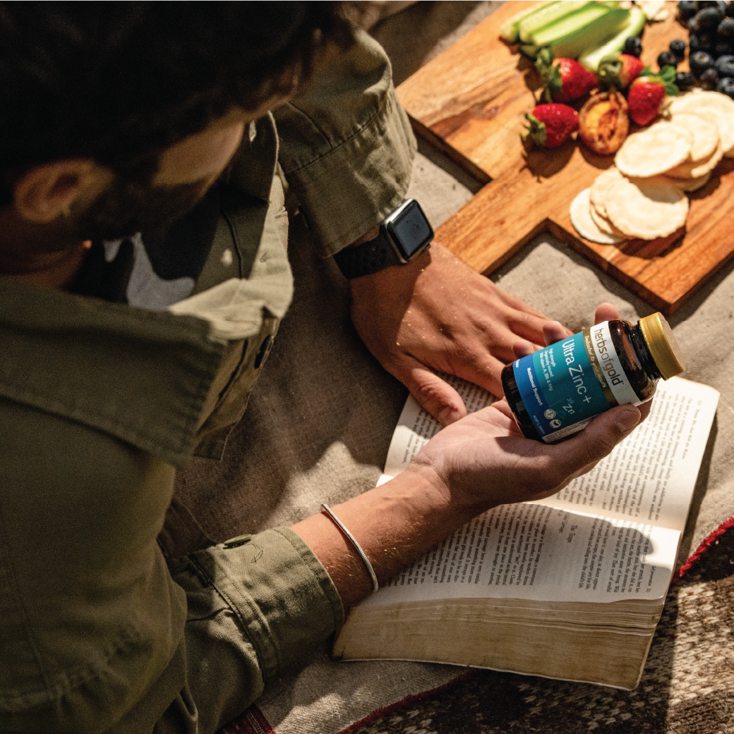 Herbs of Gold Ultra Zinc + contains high-strength zinc that is organically bound to support absorption, with cofactors vitamin A, B6 and magnesium.