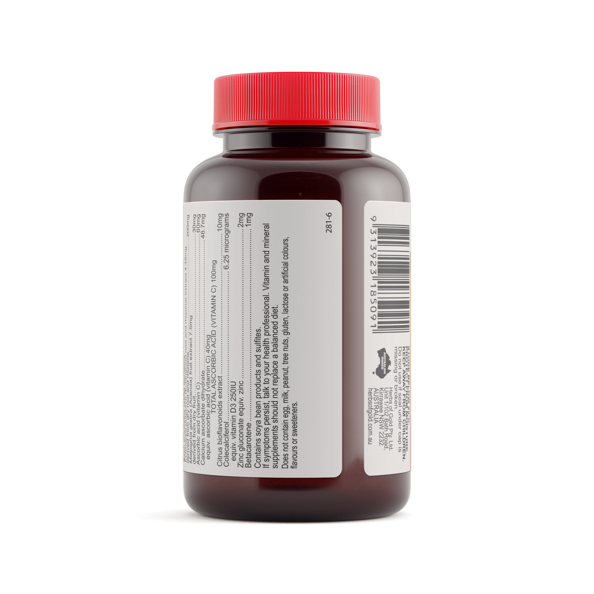 Always read the label and follow the directions for use. If symptoms persist, talk to your health professional. Not to be used in children under two years of age without medical advice. Not to be used in children under 5 years for relief of mild fever. Vitamin and mineral supplements should not replace a balanced diet. Contains soya bean products and sulfites.