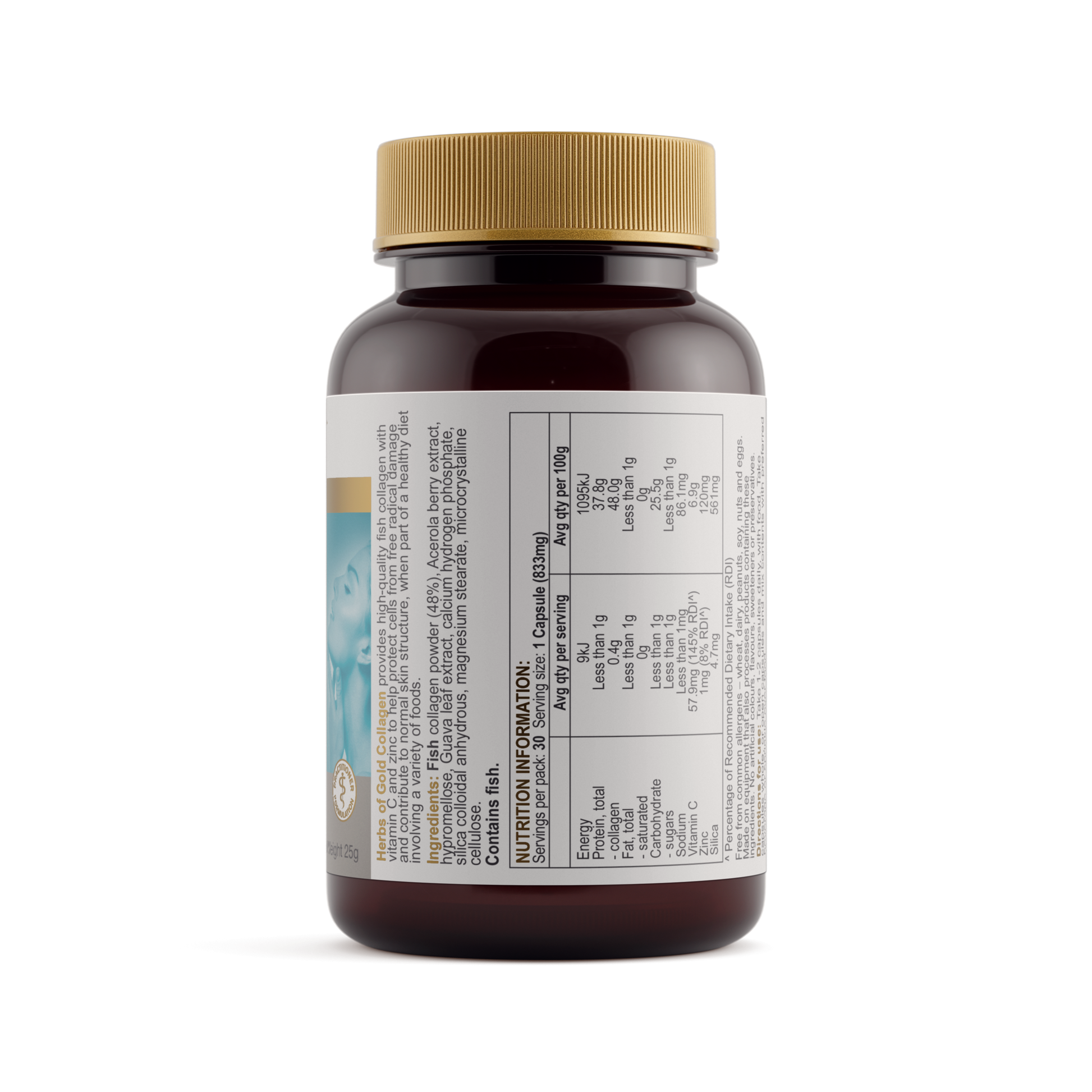 Herbs of Gold Collagen provides a high quality source of fish collagen with vitamin C and zinc to help protect cells from free radical damage and contribute to normal skin structure, when part of a healthy diet involving a variety of foods.
